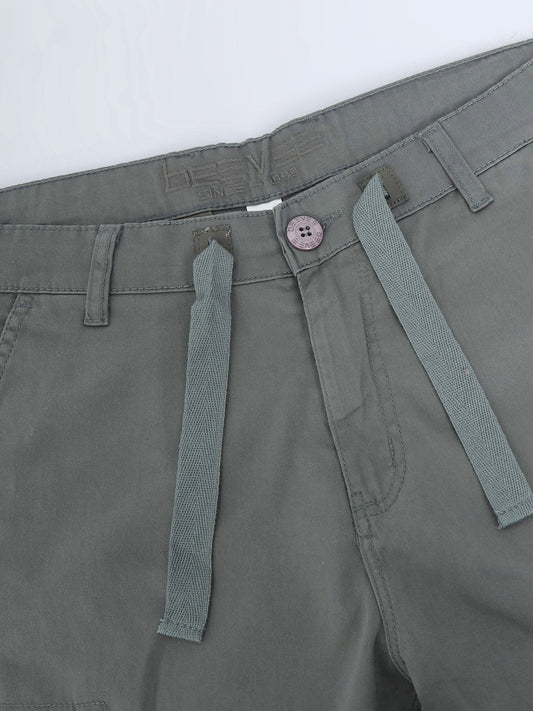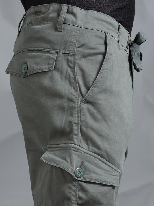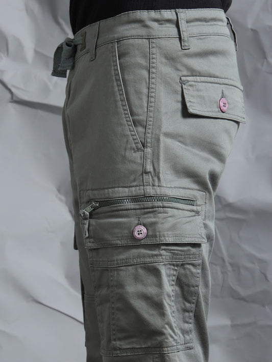 Cotton Lycra Grey Mid Rise Cargo Pant with 7 Pockets Drawstring Closure