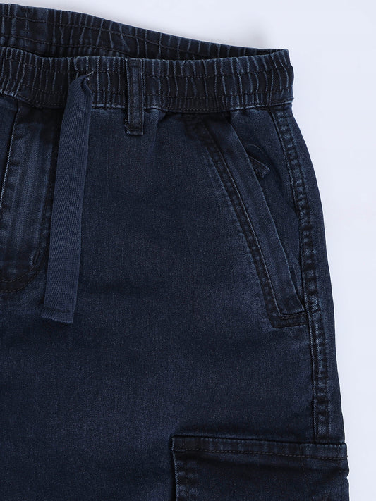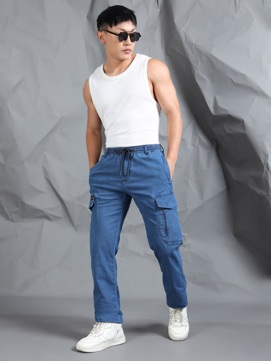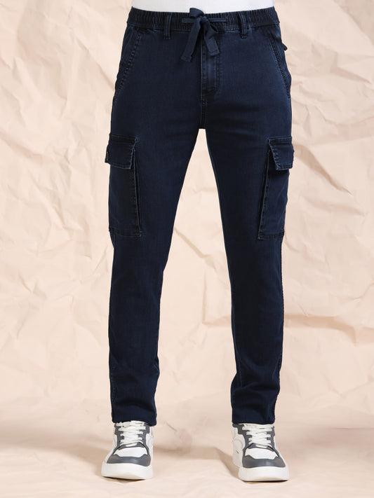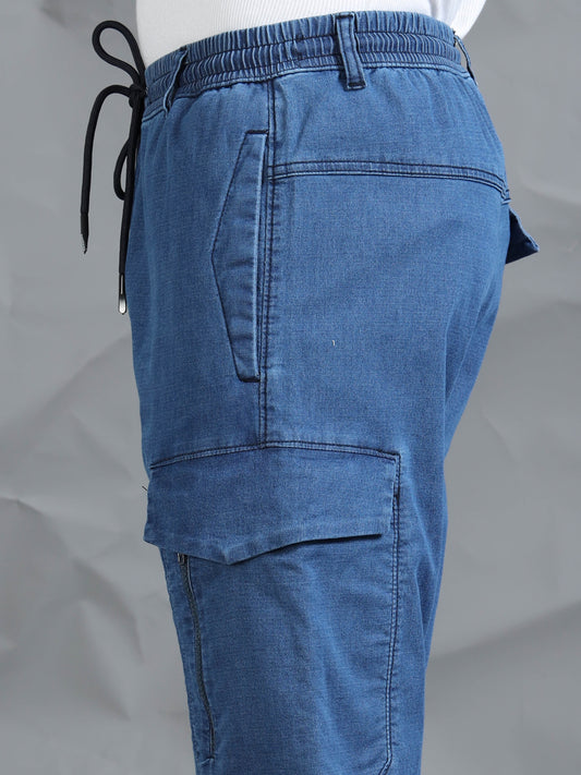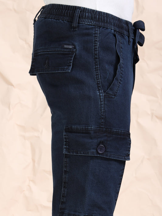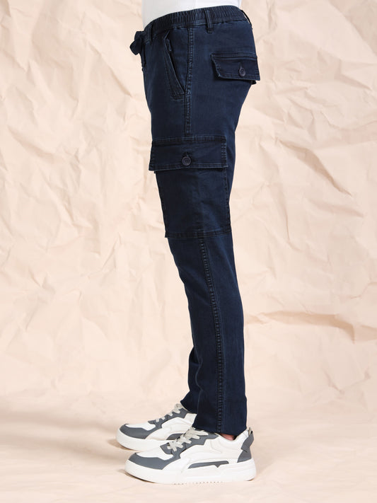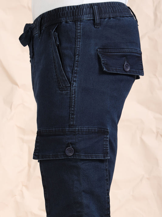 Cotton Lycra Indigo Mid Rise Cargo Pant with 7 Pockets Drawstring Closure