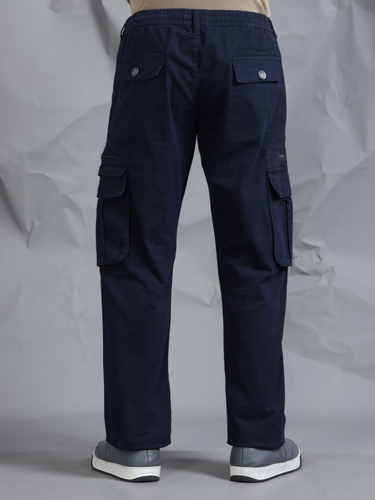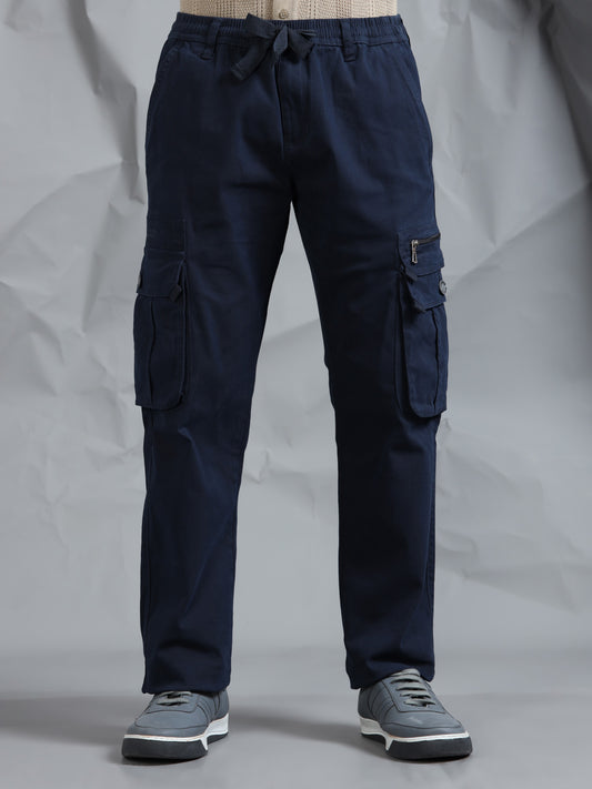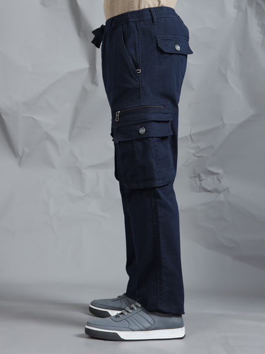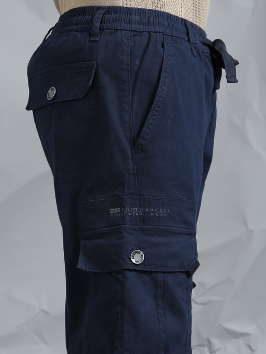 Cotton Lycra Navy Blue Mid Rise Cargo Pant with 7 Pockets Drawstring Closure