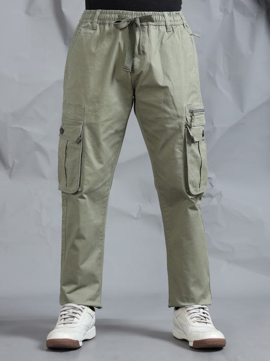 Cotton Lycra Green Mid Rise Cargo Pant with 7 Pockets Drawstring Closure