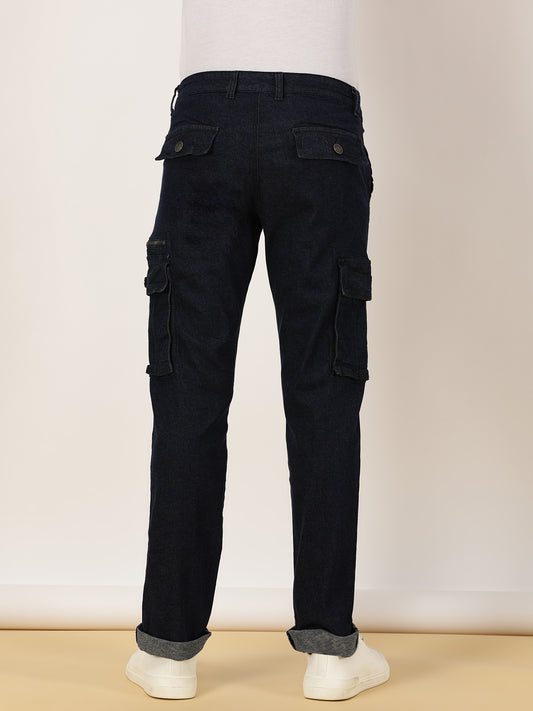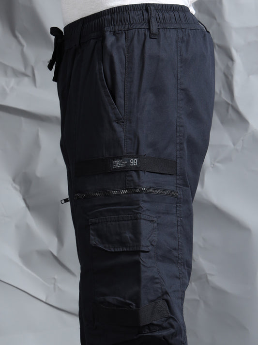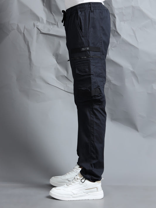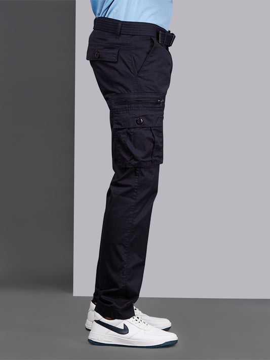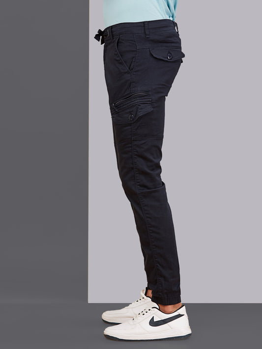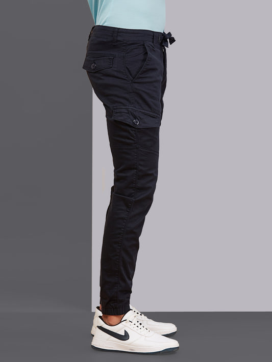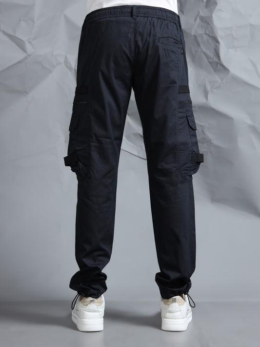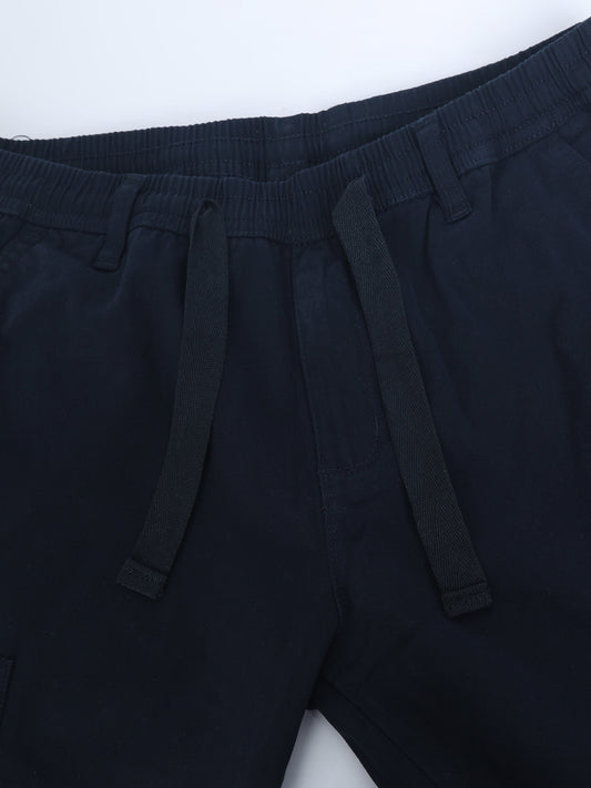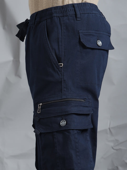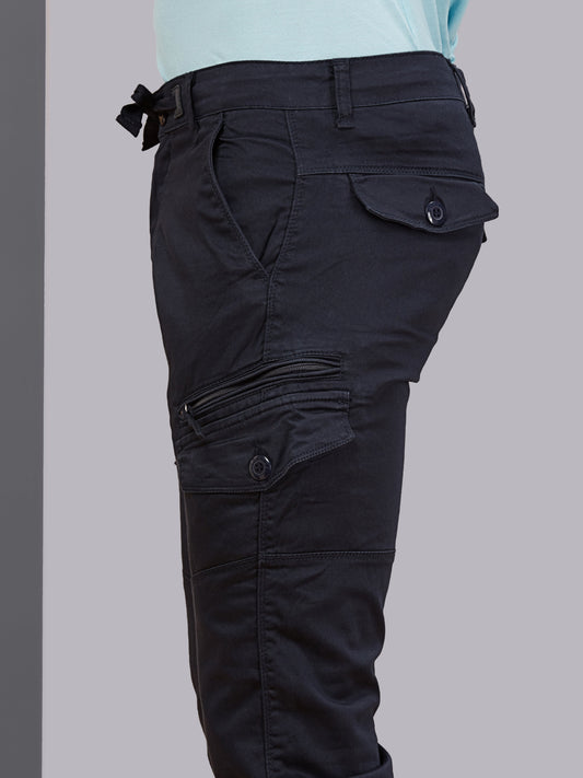 Cotton Lycra Navy Blue Mid Rise Cargo Pant with 7 Pockets Drawstring Closure