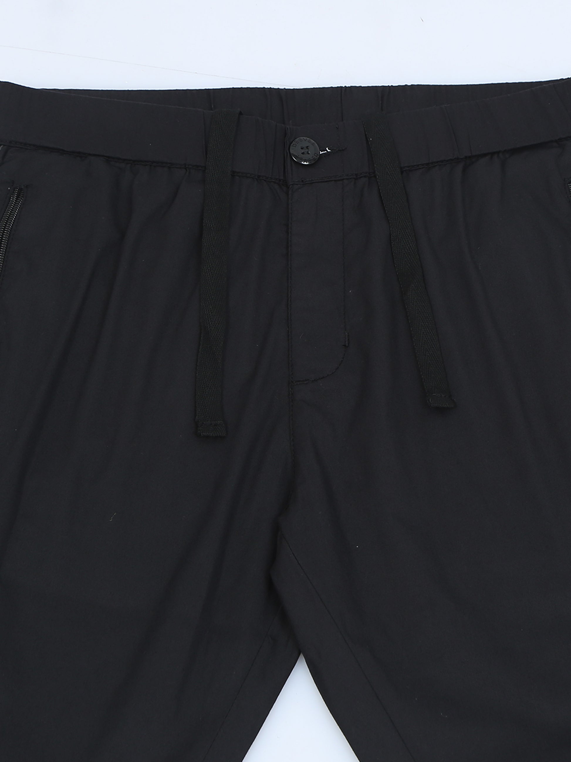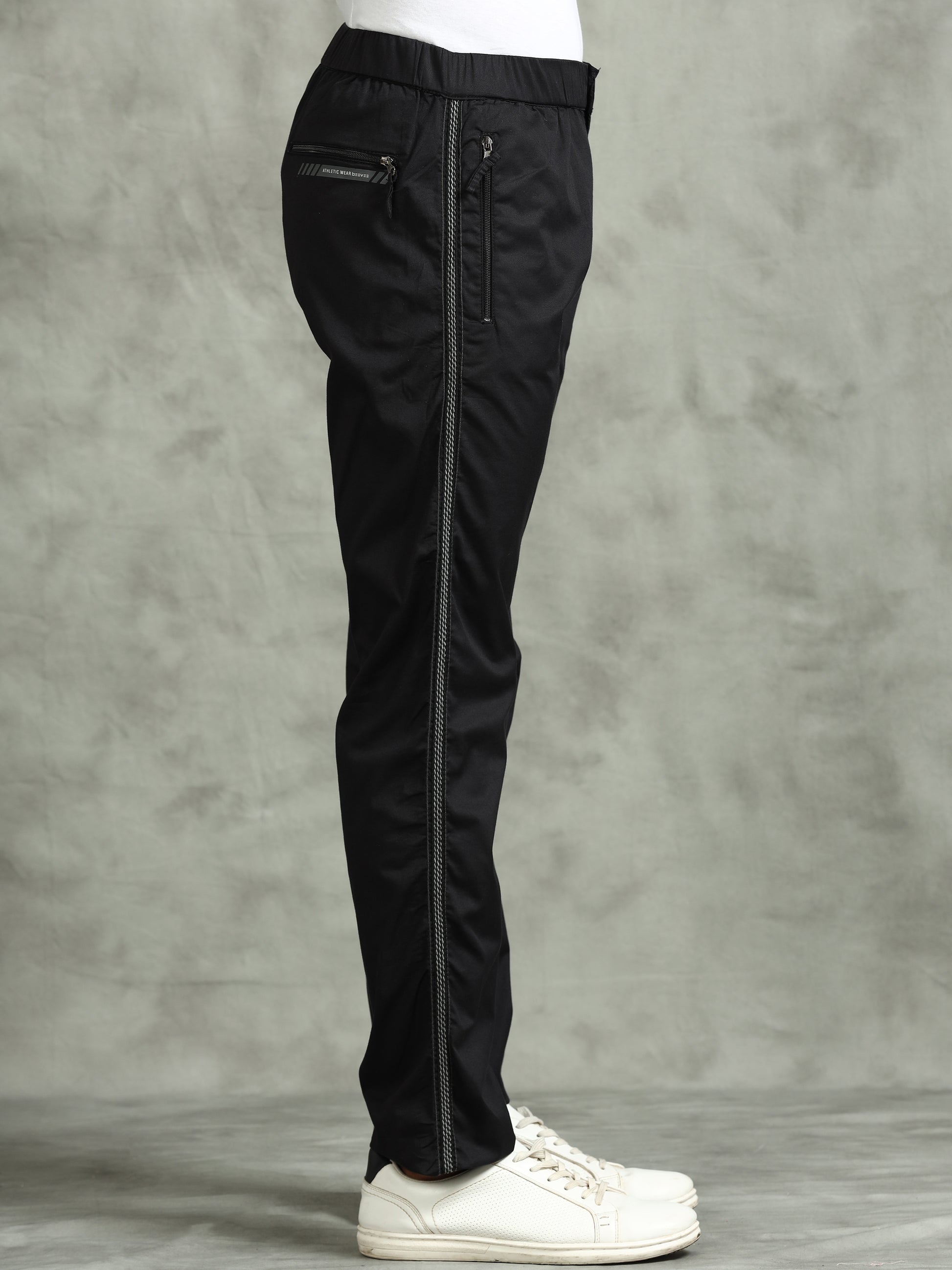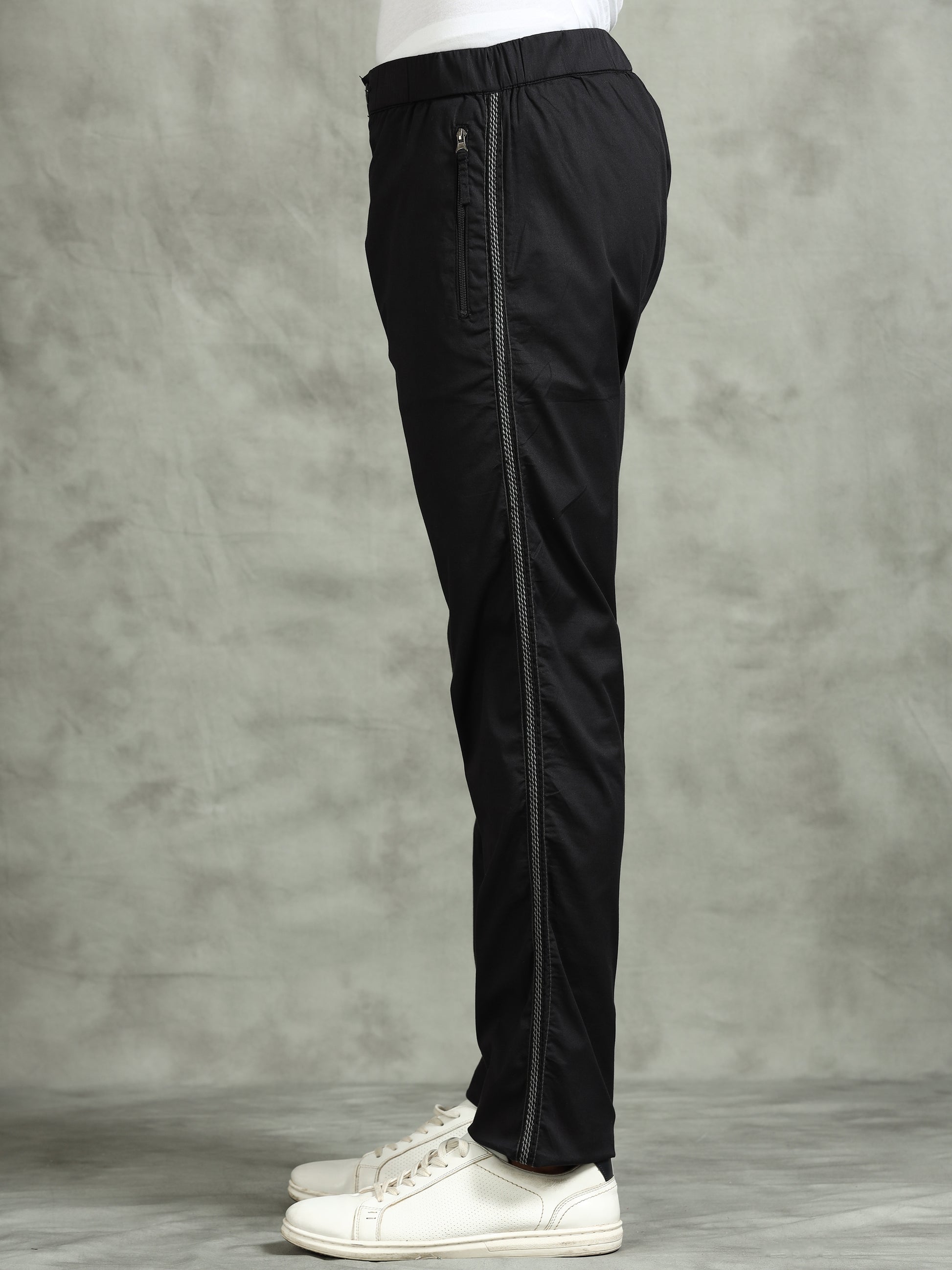 Elasticated Waist Zip Pocket Stretchable Black Lounge Pants with Side Tape