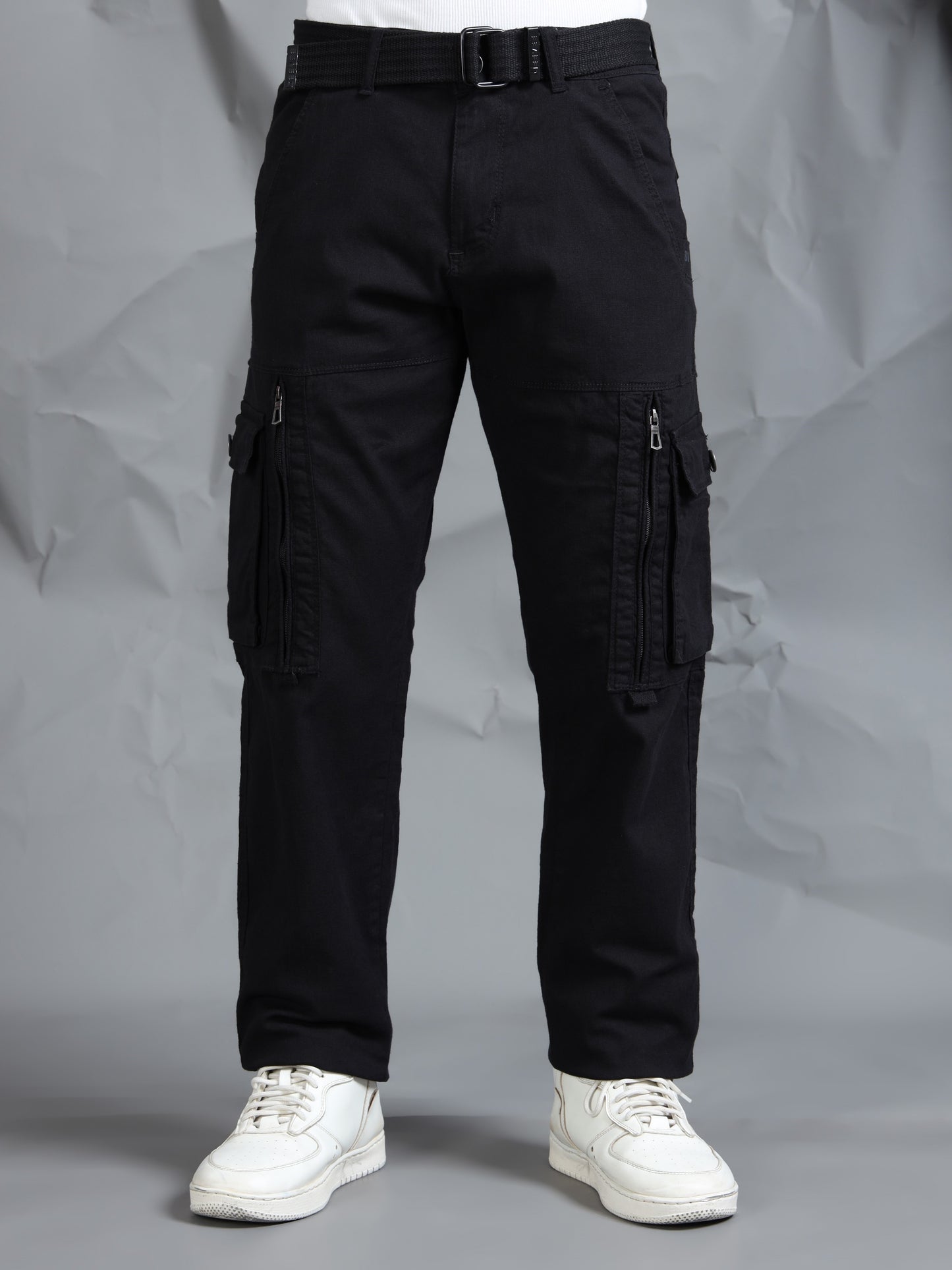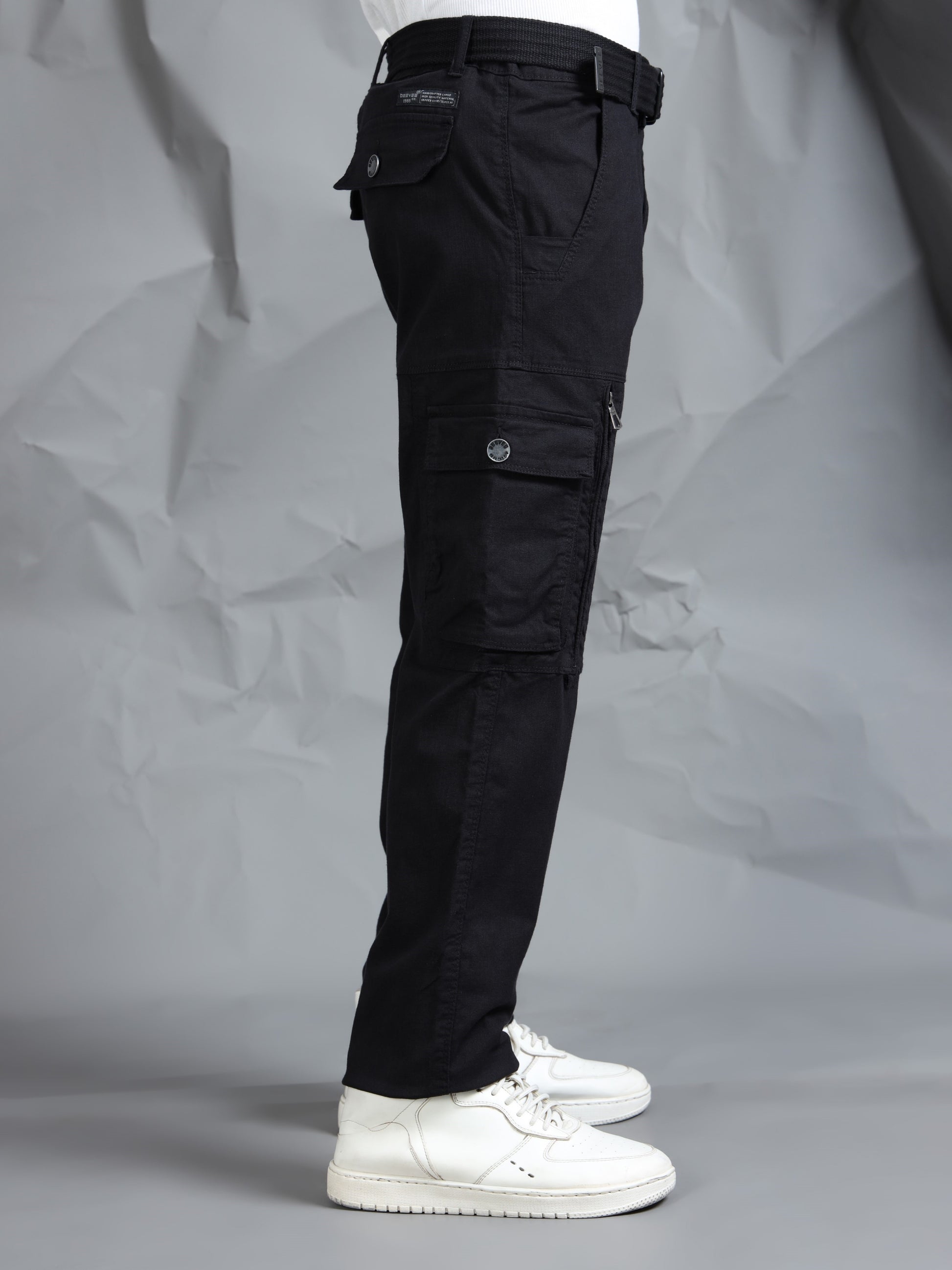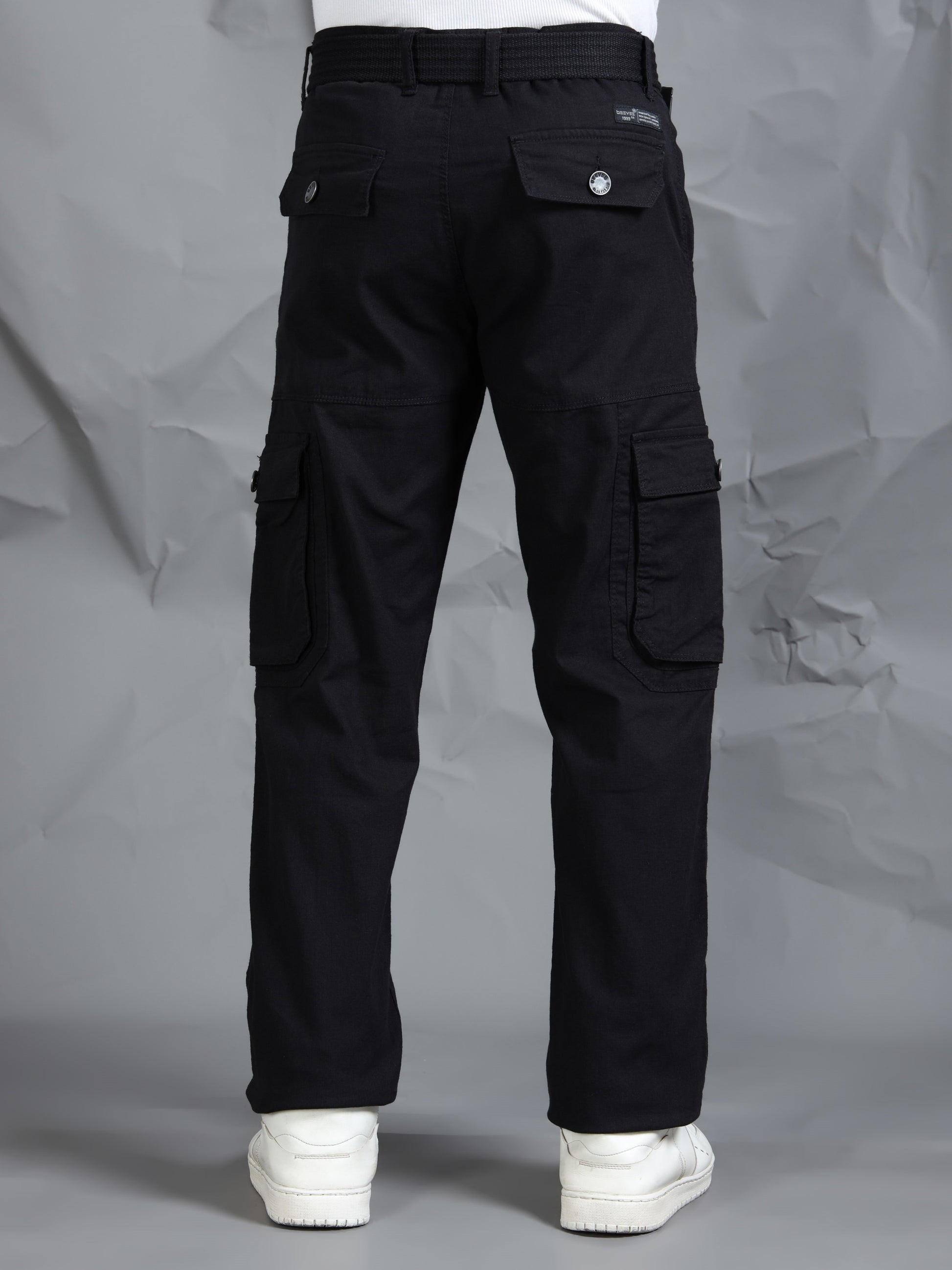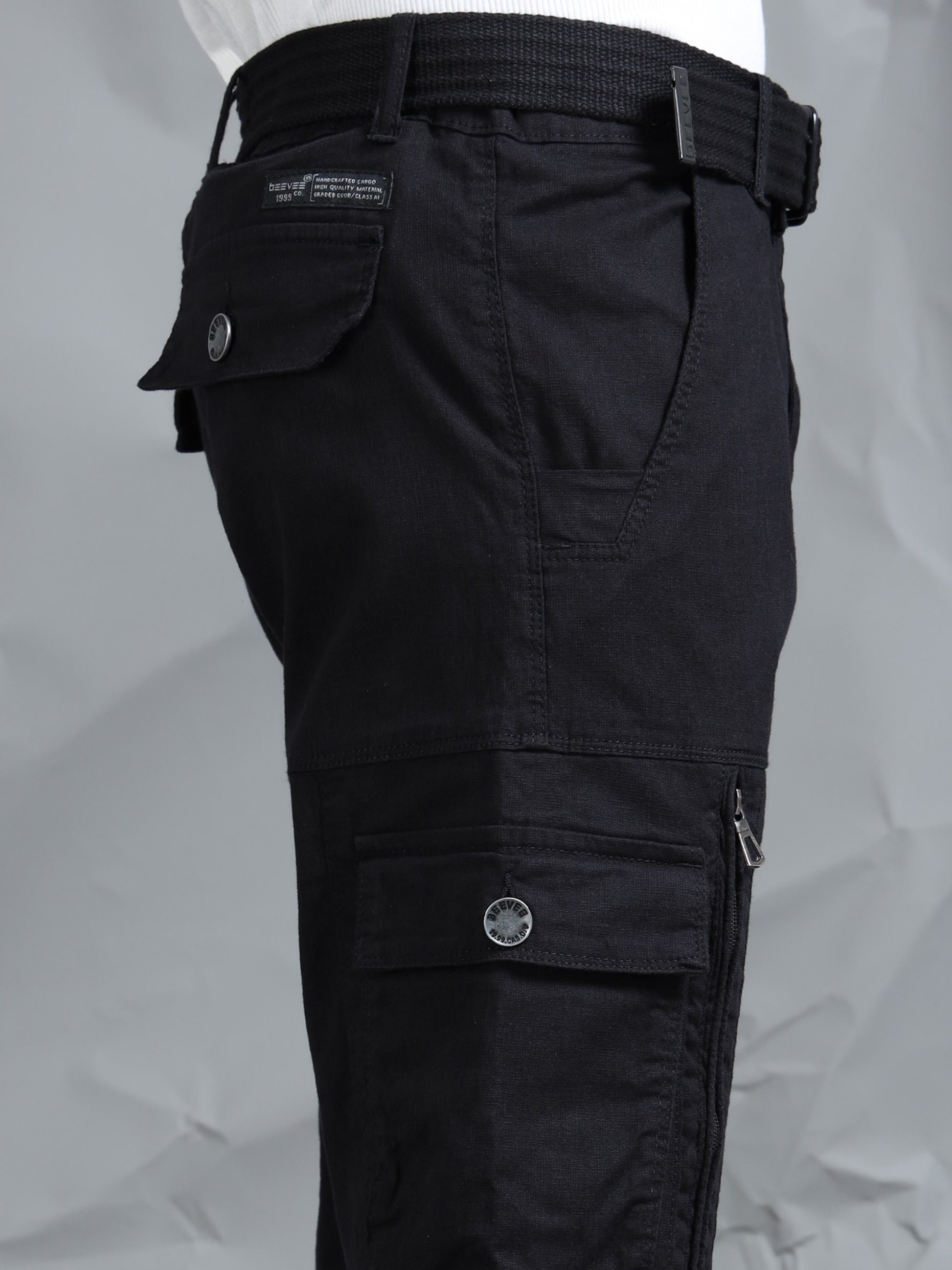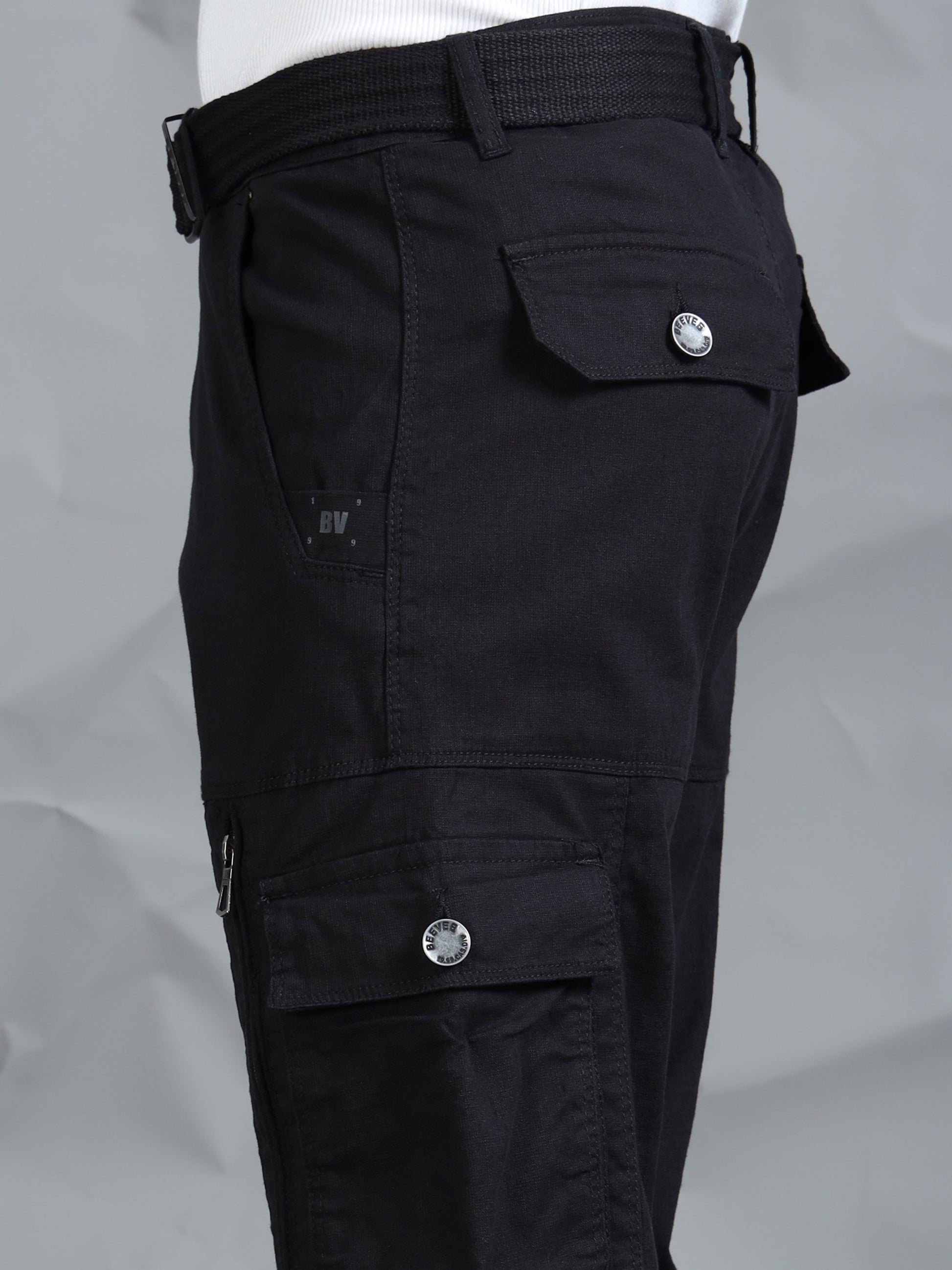 Cotton Lycra Black Mid Rise Cargo Pant with 8 Pockets