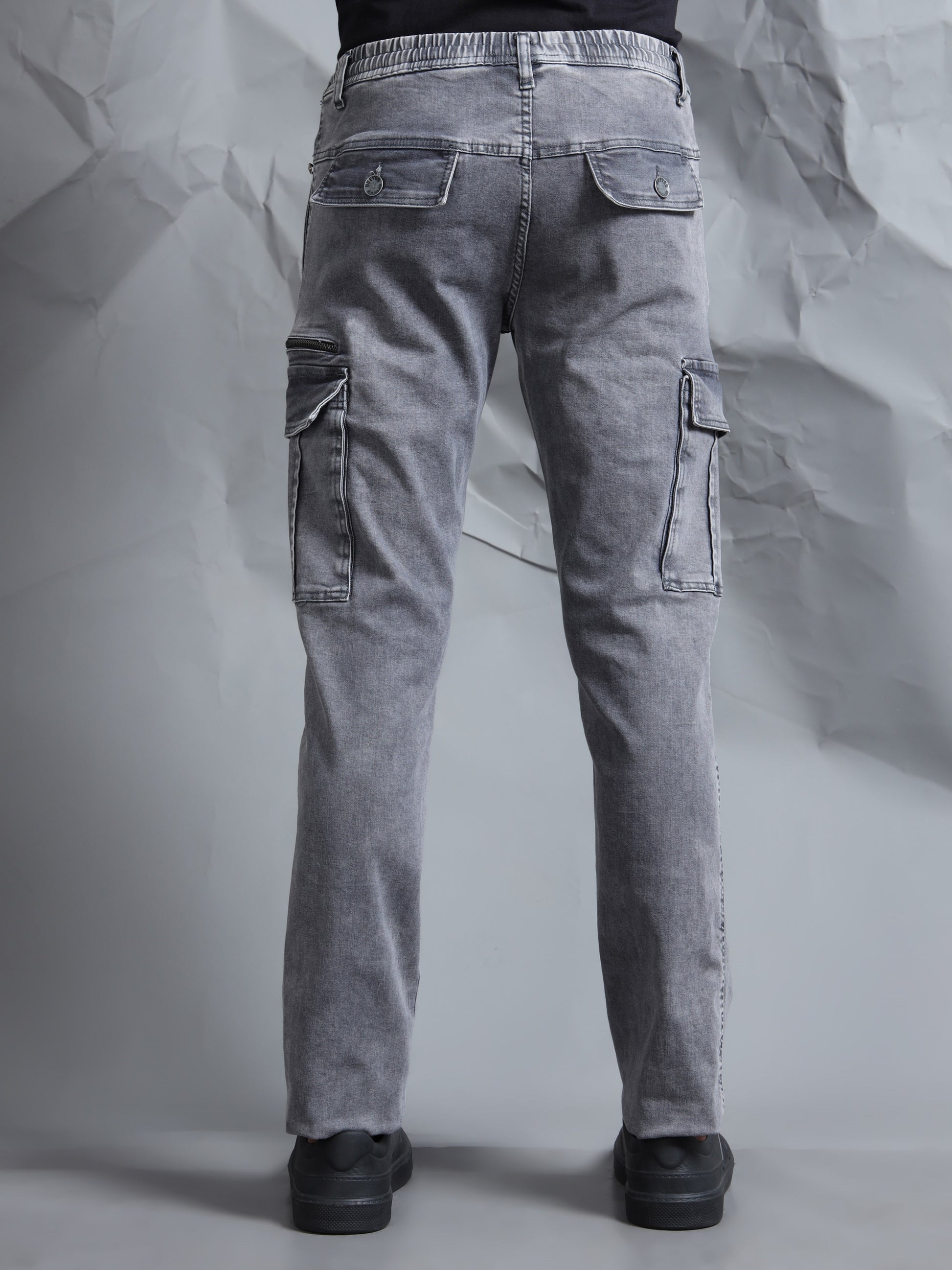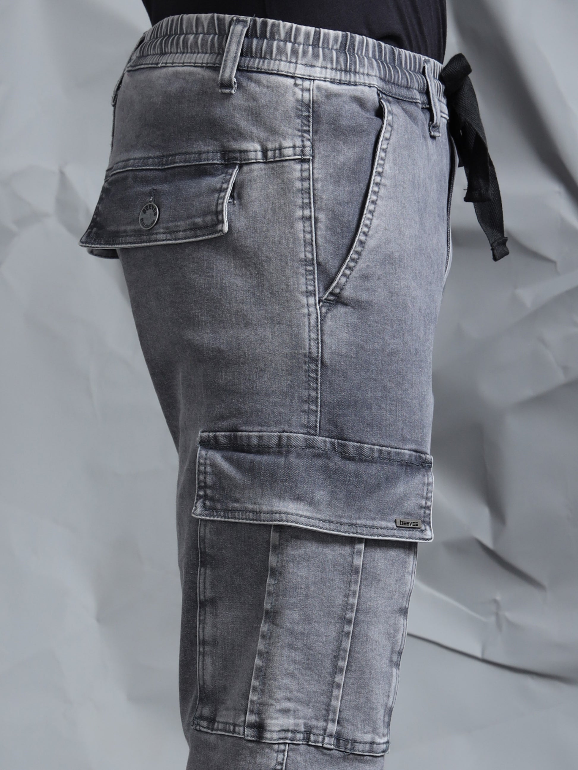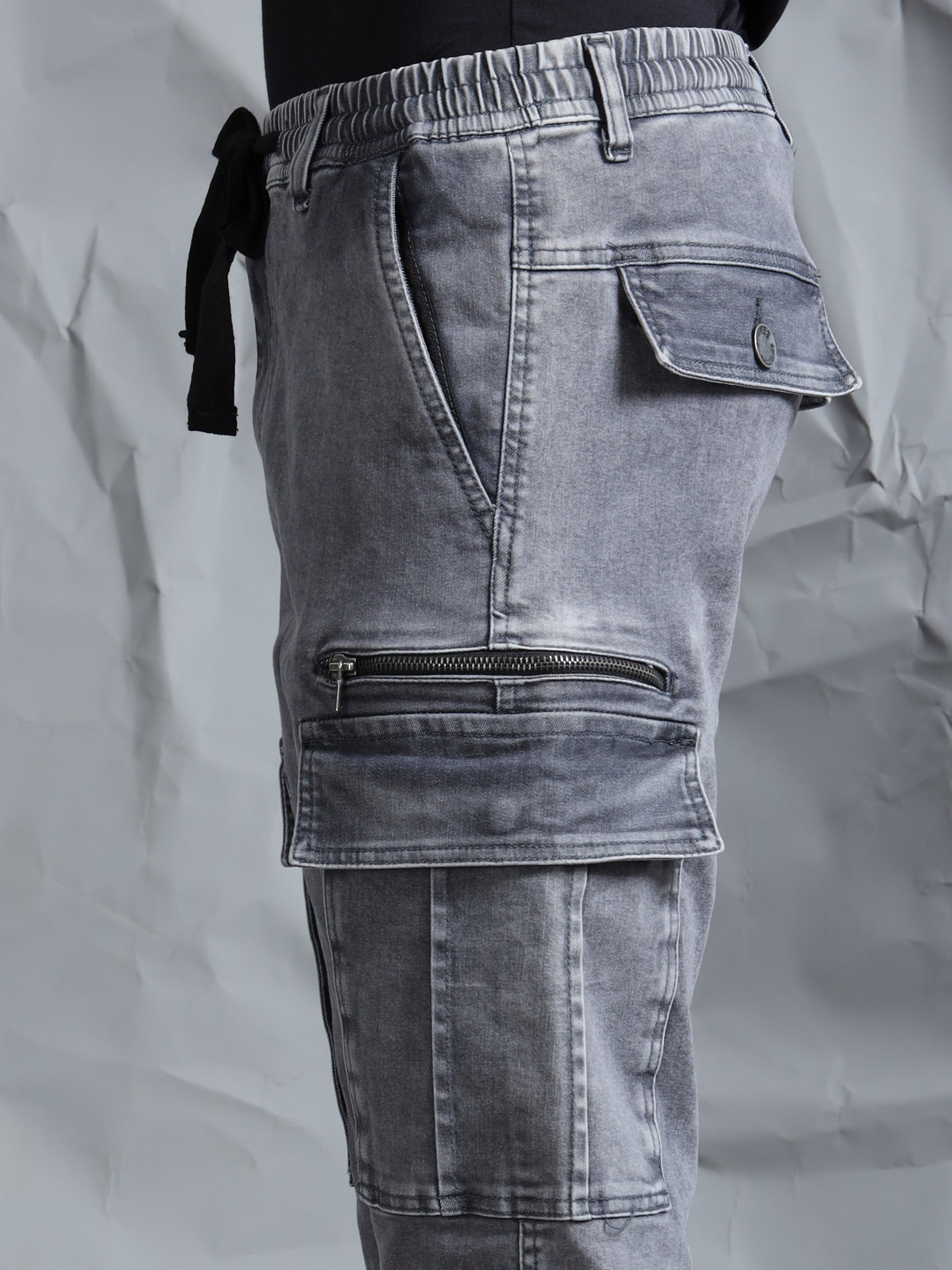 Cotton Lycra Grey Mid Rise Cargo Pant with 7 Pockets Drawstring Closure