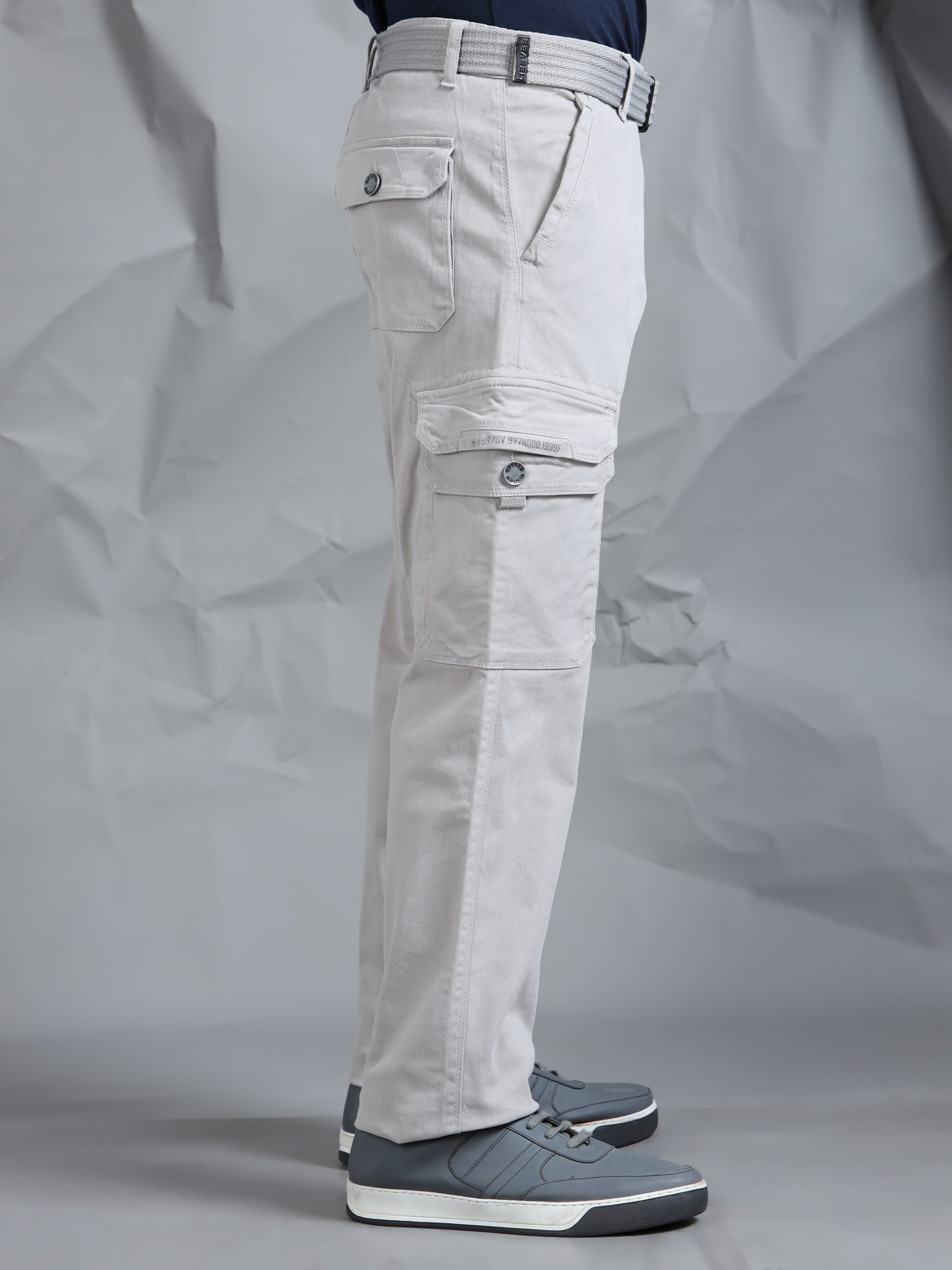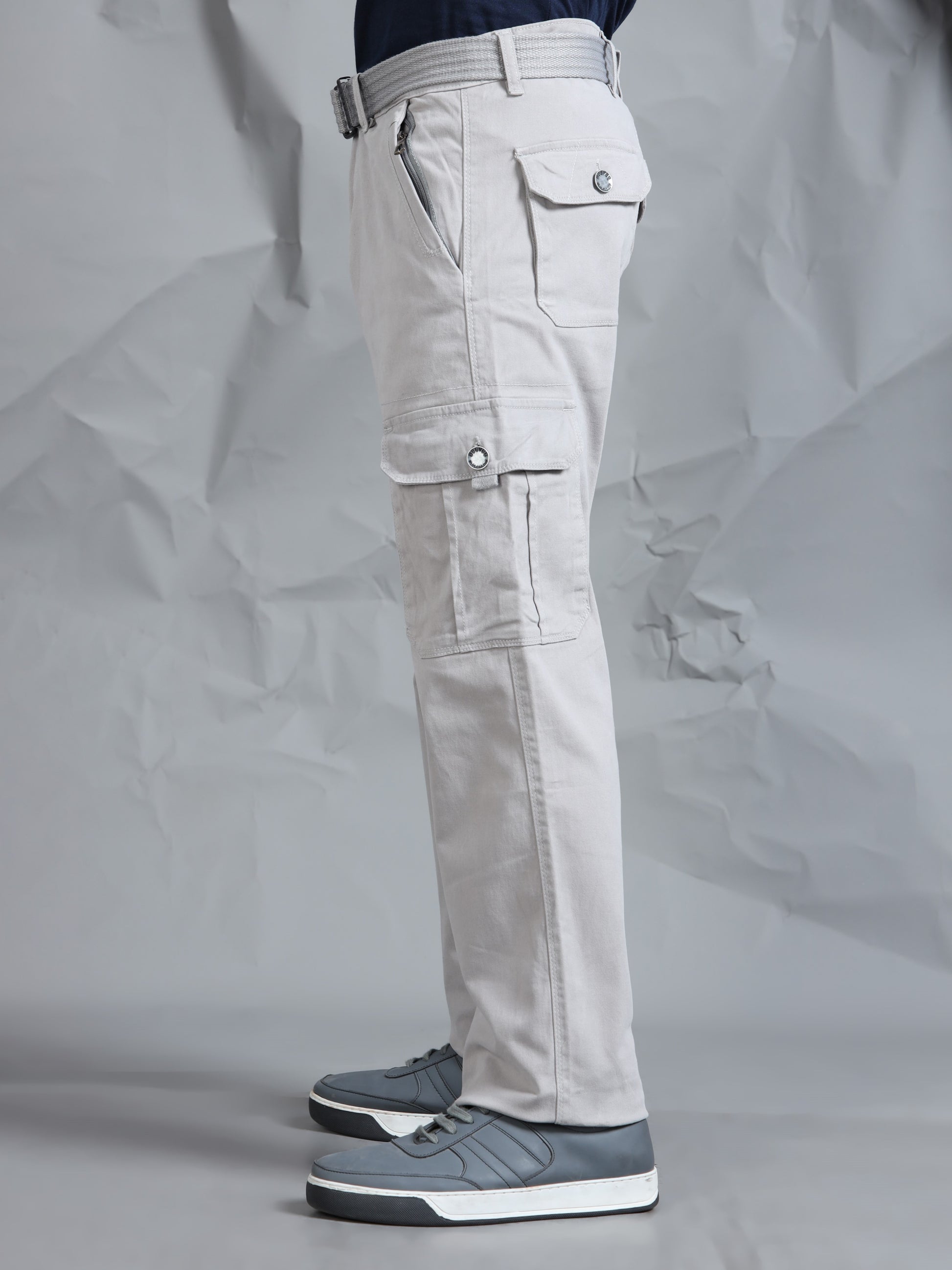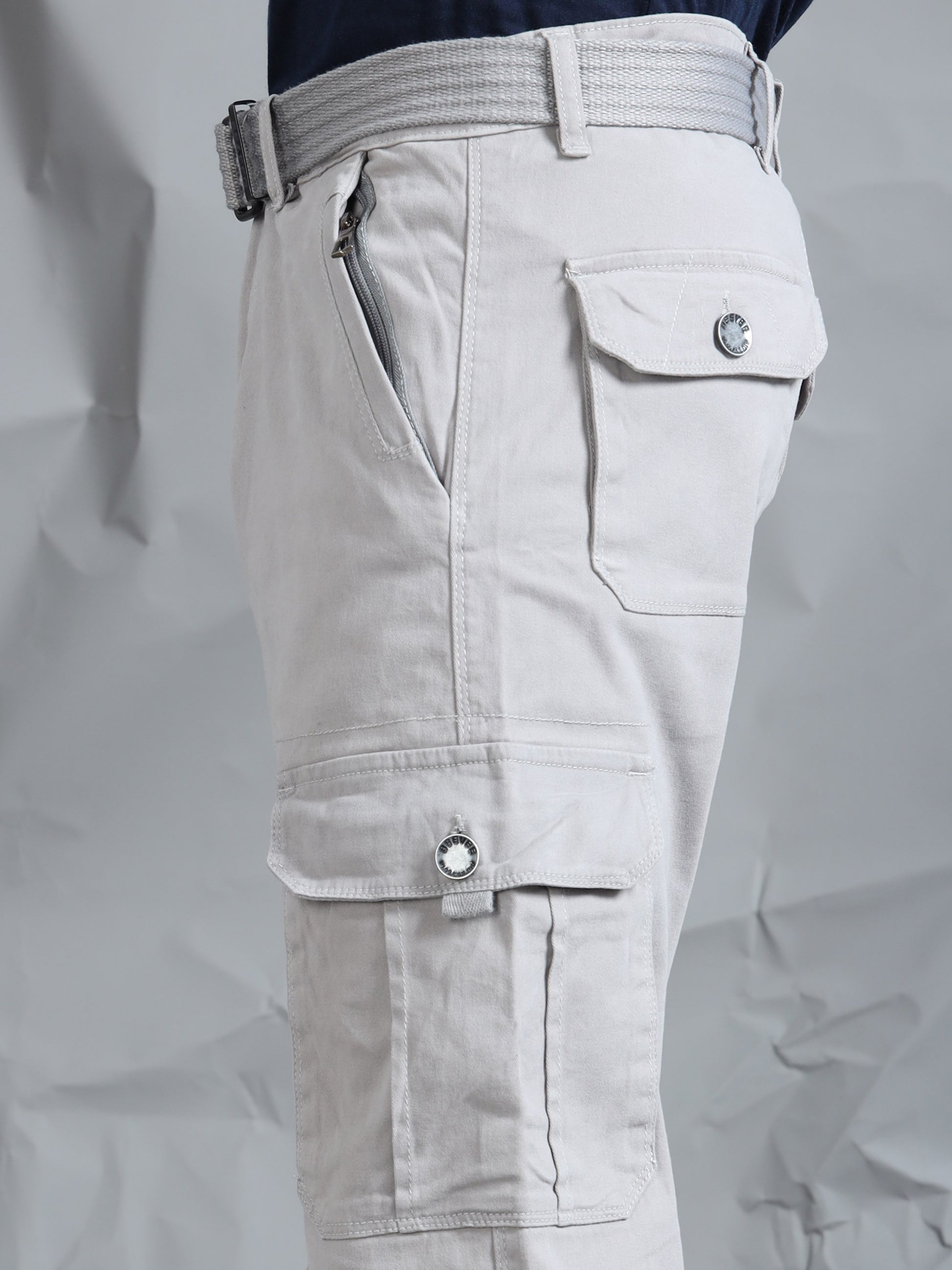 Description - Men’s 7-Pocket Cargo Pants with a canvas belts feature a rugged yet versatile design, offering ample storage with seven functional pockets—typically including spacious side cargo pockets with one having additional pocket with snap button & print, front slash pockets with one having additional zip pocket & back flap pockets with metal button. Crafted in durable cotton or cotton-blend fabrics, they provide comfort and breathability, often with a relaxed or straight fit. Perfect for casual wear, outdoor activities, or work settings, these cargos combine practicality with modern style, making them a staple in any wardrobe.