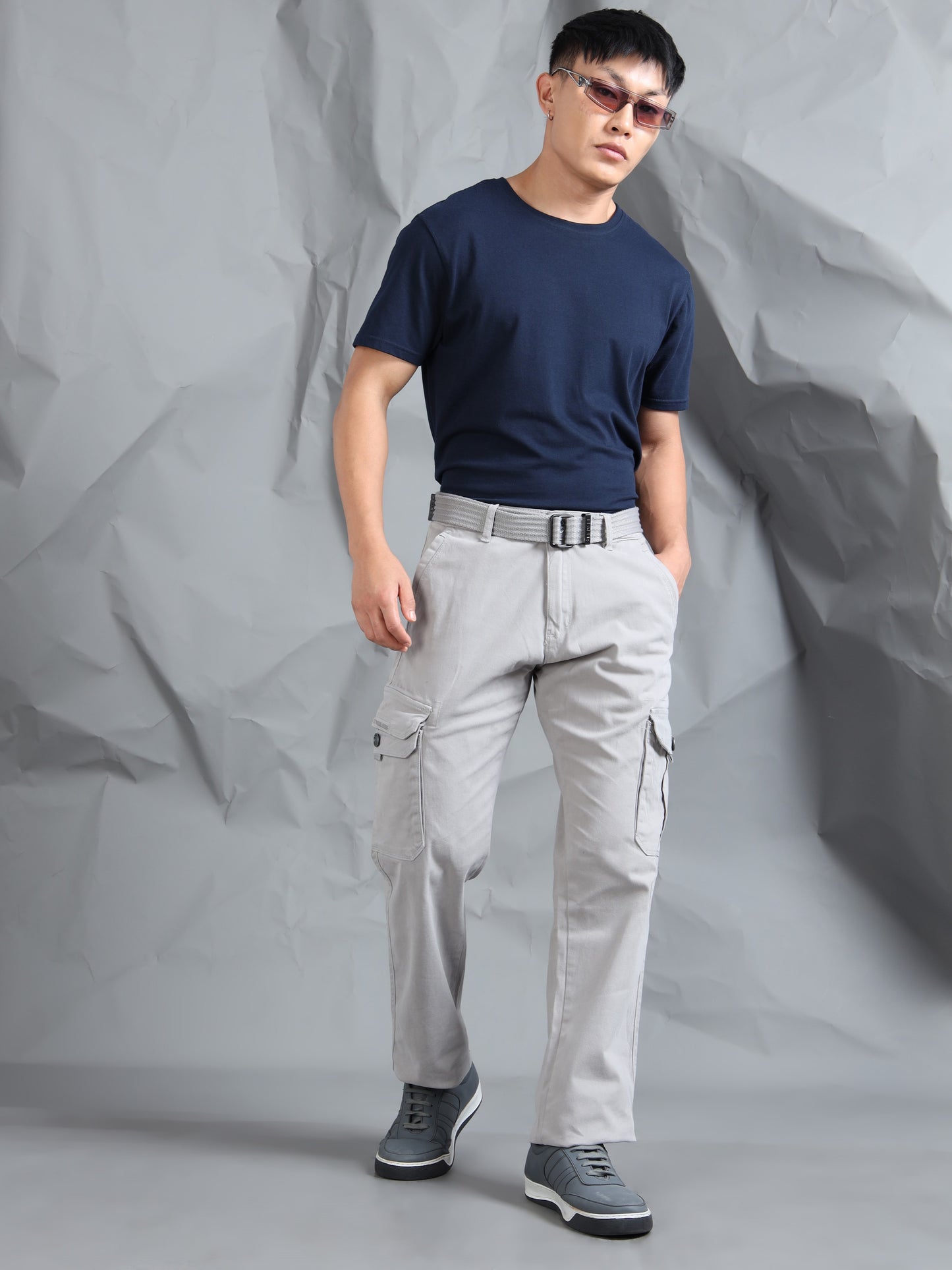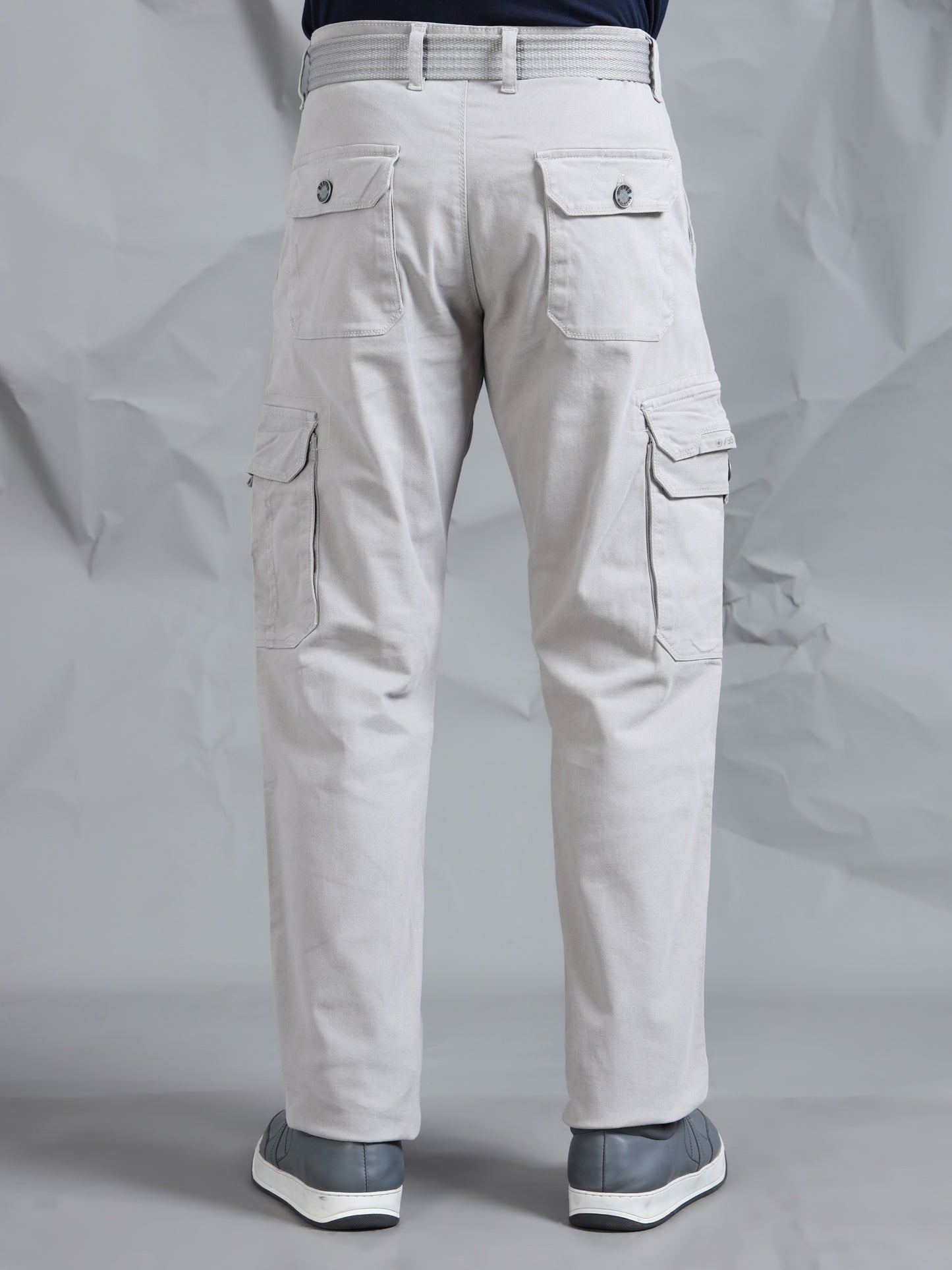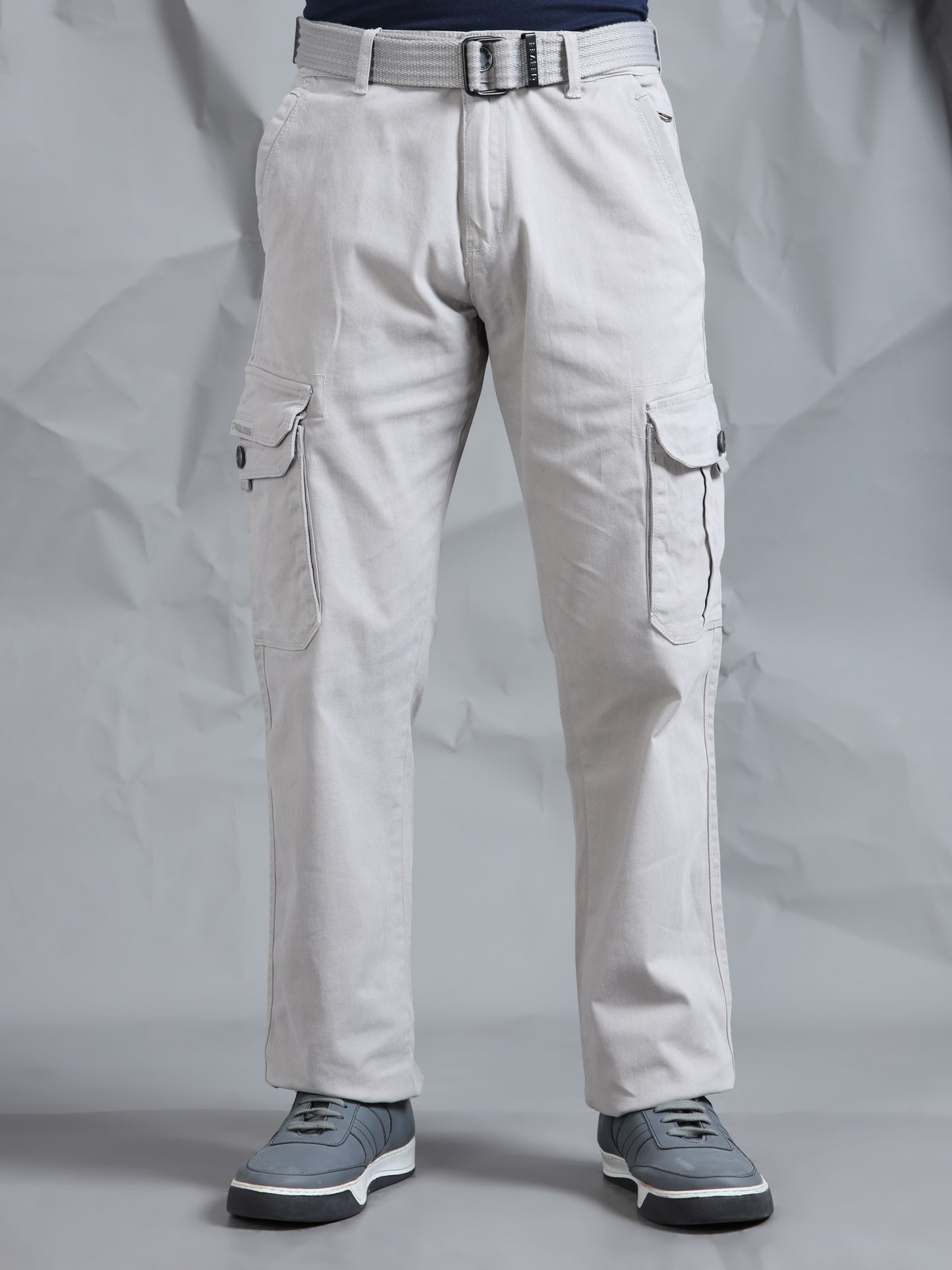 Description - Men’s 7-Pocket Cargo Pants with a canvas belts feature a rugged yet versatile design, offering ample storage with seven functional pockets—typically including spacious side cargo pockets with one having additional pocket with snap button & print, front slash pockets with one having additional zip pocket & back flap pockets with metal button. Crafted in durable cotton or cotton-blend fabrics, they provide comfort and breathability, often with a relaxed or straight fit. Perfect for casual wear, outdoor activities, or work settings, these cargos combine practicality with modern style, making them a staple in any wardrobe.