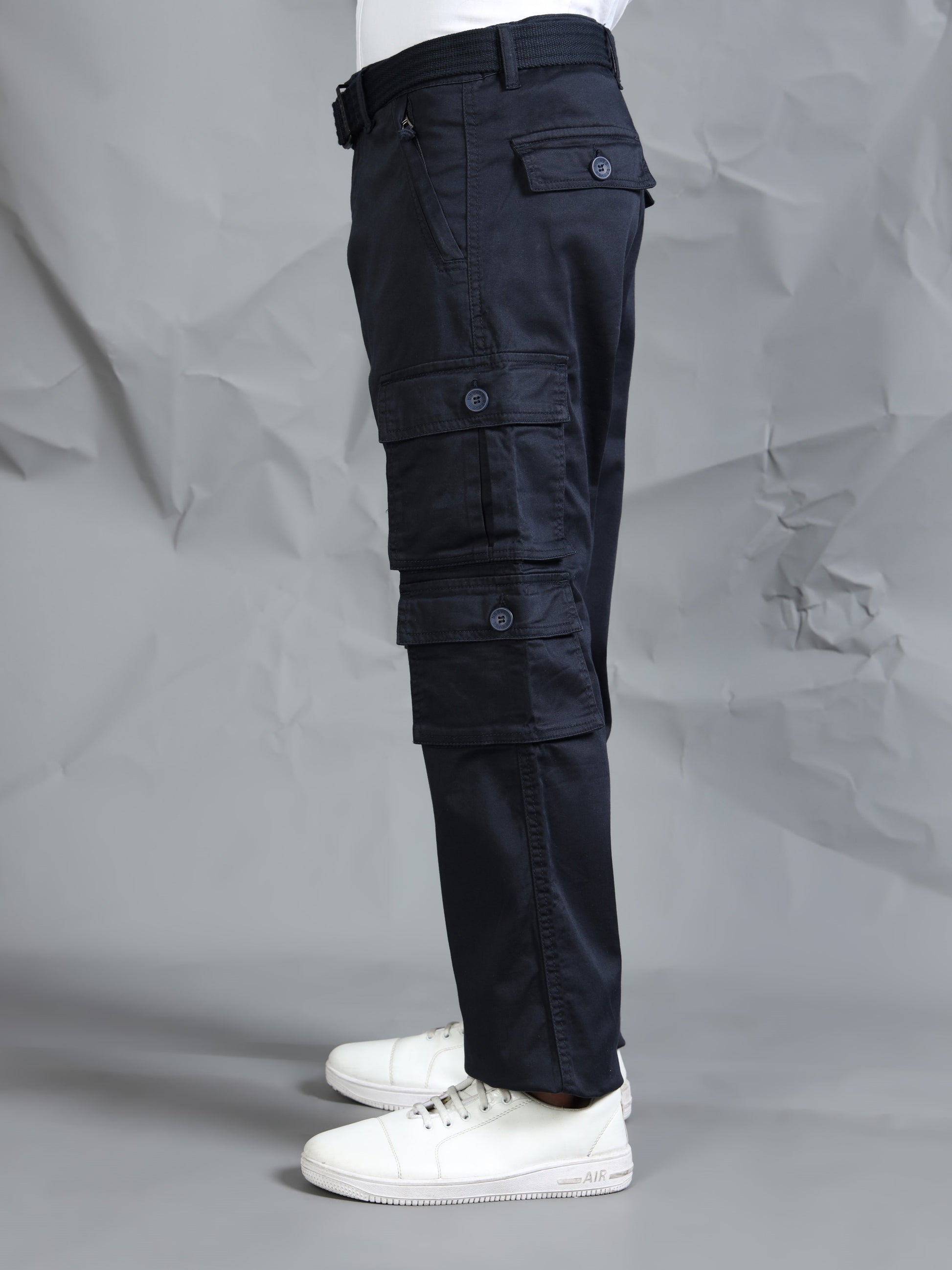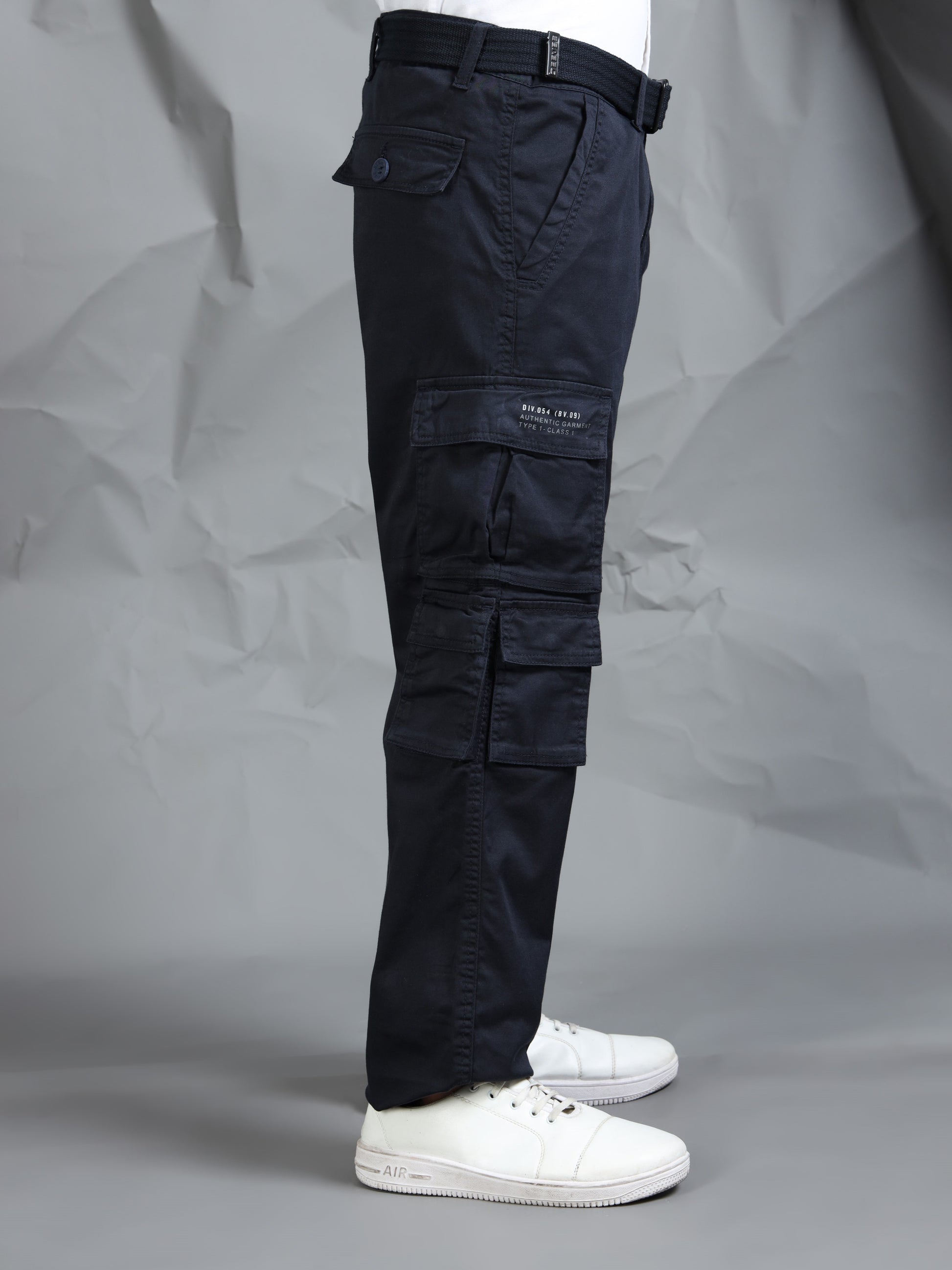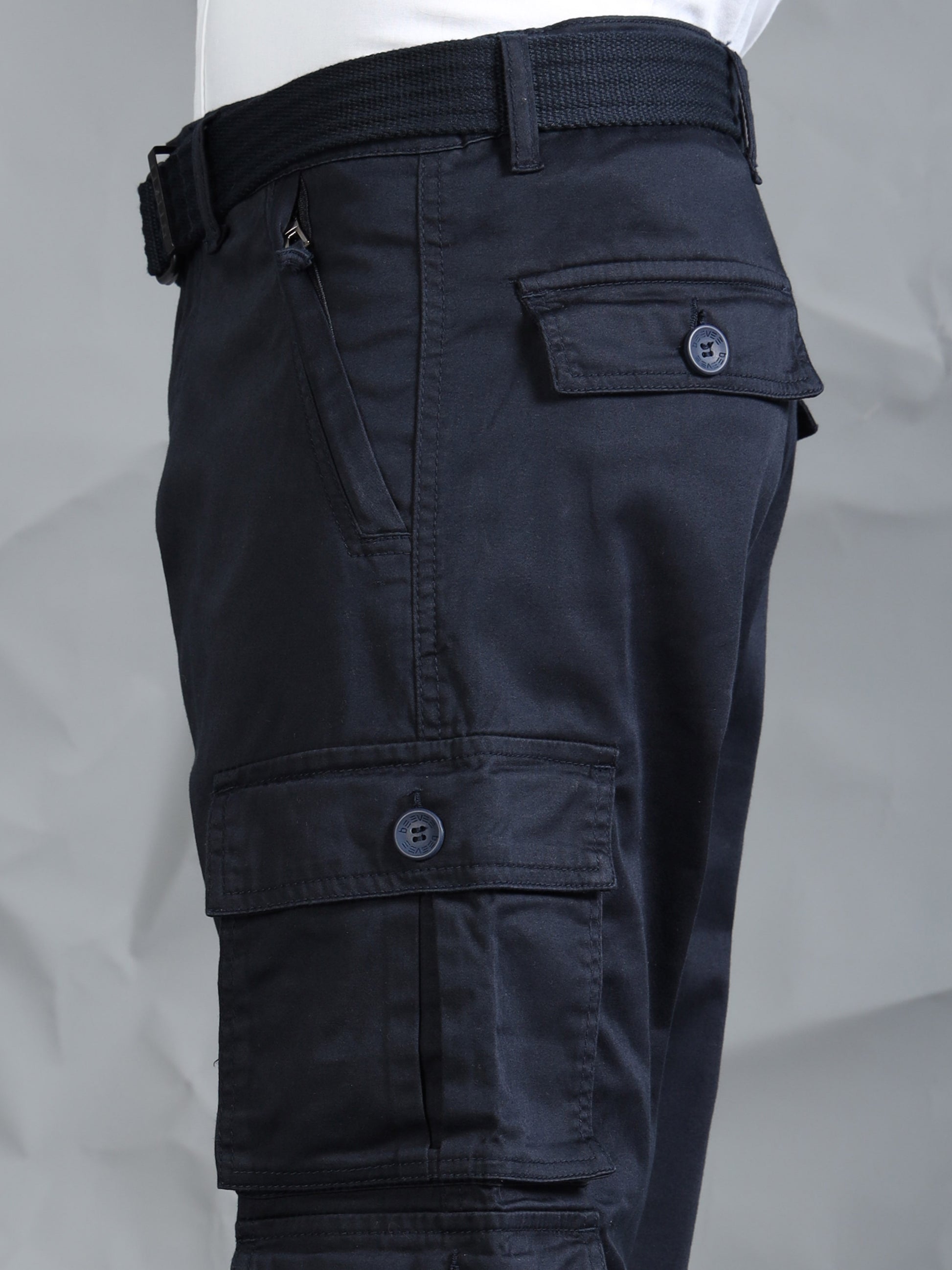 Description - Stay ready for anything with these rugged and functional 9-pocket Fashion cargo pants. Designed for comfort and convenience, they feature a relaxed fit, durable cotton-stretch fabric, and a utility-inspired layout with ample storage. With multiple secure pockets which Includes front 2 cross pocket with inside zip on wearer’s left, 2 bellow pocket with Flap on wearer’s left, 3 bellow pockets with Flap on wearer’s right and 2 back pocket with flaps. All these pockets come with the keyhole branded button. It comes with a DTM detachable canvas belt with buckle for required fastening. These cargos are perfect for travel, work, or everyday wear.