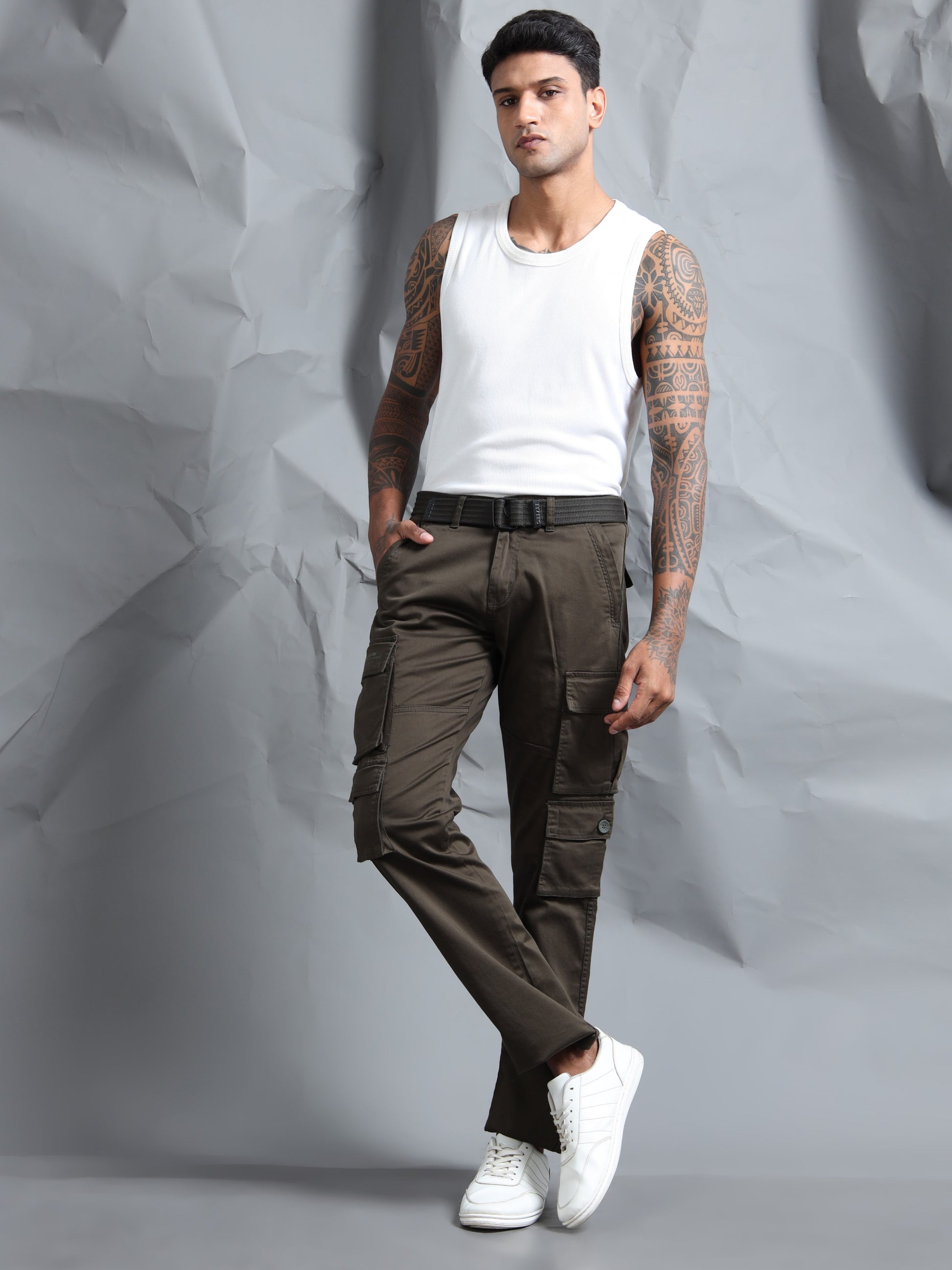 Description - Stay ready for anything with these rugged and functional 9-pocket Fashion cargo pants. Designed for comfort and convenience, they feature a relaxed fit, durable cotton-stretch fabric, and a utility-inspired layout with ample storage. With multiple secure pockets which Includes front 2 cross pocket with inside zip on wearer’s left, 2 bellow pocket with Flap on wearer’s left, 3 bellow pockets with Flap on wearer’s right and 2 back pocket with flaps. All these pockets come with the keyhole branded button. It comes with a DTM detachable canvas belt with buckle for required fastening. These cargos areperfect for travel, work, or everyday wear.
